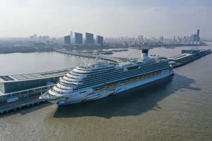 国产首艘大型邮轮“爱达·魔都号”停靠在上海吴淞口国际邮轮港(2024年1月1日摄,无人机照片)。 新华社记者 丁汀 摄
